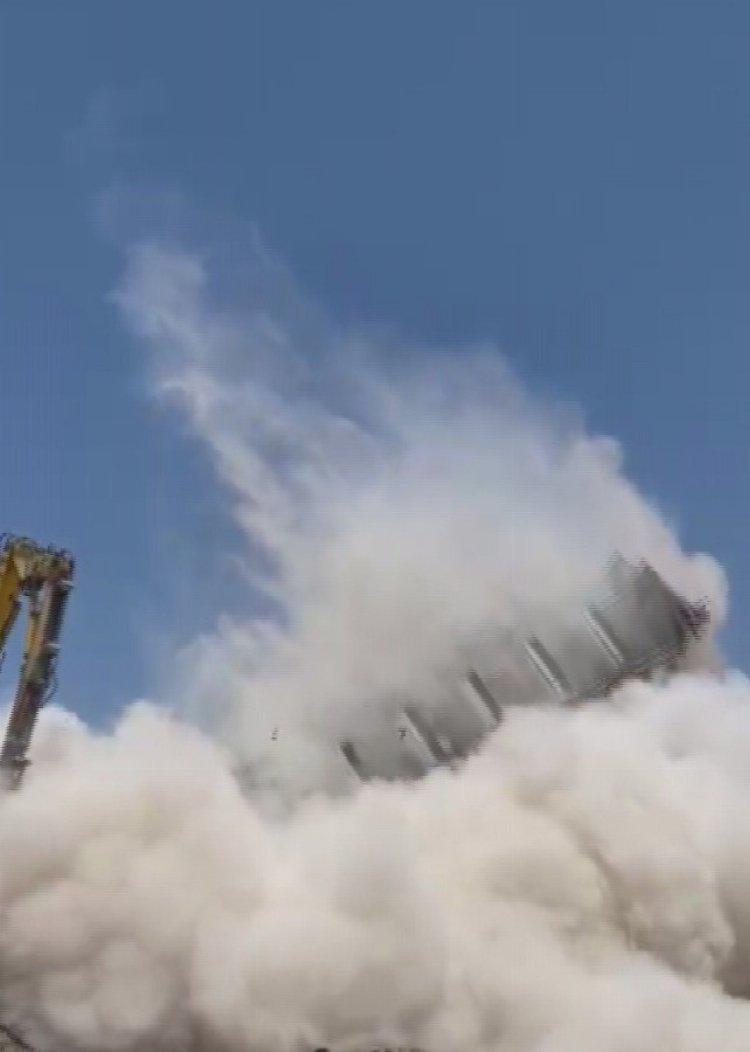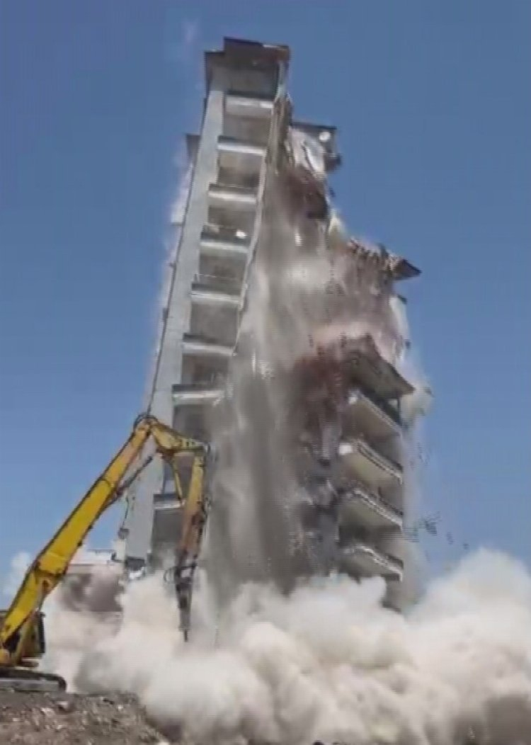 Kahramanmaraş merkezli depremlerde büyük yıkımın yaşandığı Hatay'da mahkeme süreci tamamlanan binalar yıkılmaya devam ediyor. Depremin vurduğu Antakya ilçesi Akasya Mahallesi'nde mahkeme süreci tamamlanan 10 katlı bina, iş makinesinin darbesiyle kontrollü olarak yıkıldı. Devasa binanın kontrollü olarak yıkıldığı anlar cep telefonu kamerasıyla saniye saniye görüntülendi. Görüntülerde; vatandaşların yıkılma anında yaşadığı panik ve kaçış anları kameraya yansıdı. 10 katlı binanın kontrollü yıkılma sırasında herhangi bir olumsuzluk yaşanmazken ortaya çıkan ses ve sarsıntı vatandaşlarda adeta deprem etkisi oluşturdu.