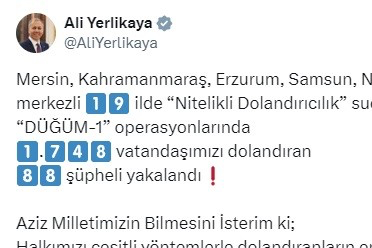 İçişleri Bakanı Ali Yerlikaya, Mersin, Kahramanmaraş, Erzurum, Samsun, Nevşehir ve Balıkesir merkezli 19 ilde "Nitelikli Dolandırıcılık" suçuna yönelik düzenlenen "DÜĞÜM-1" operasyonlarında bin 748 kişiyi dolandıran 88 şüphelinin yakalandığını bildirdi.