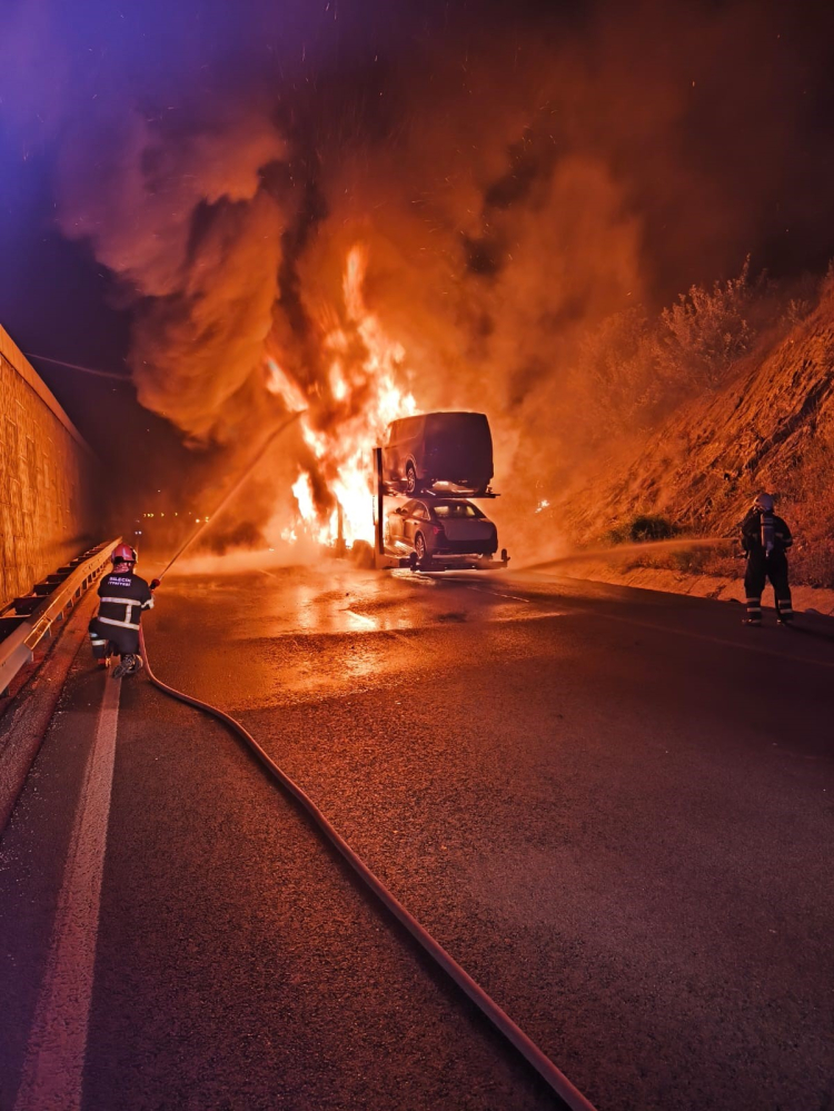 Bilecik'te seyir halinde bir anda motor bölümden alevler yükselen tırın dorsesinde yüklü 8 adet sıfır araç kullanılmaz hale geldi.