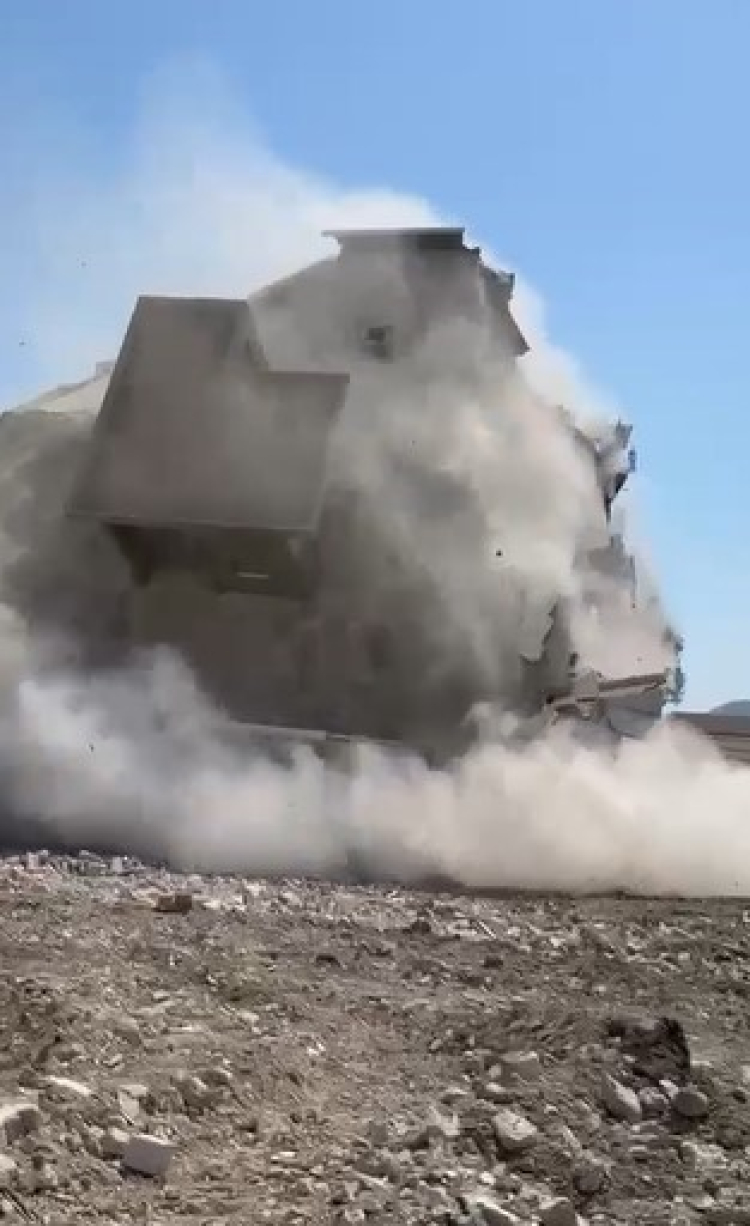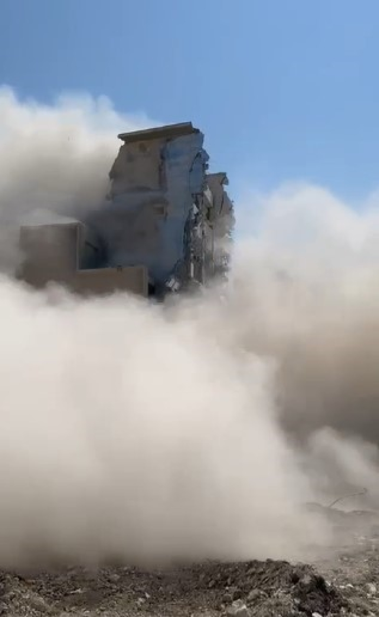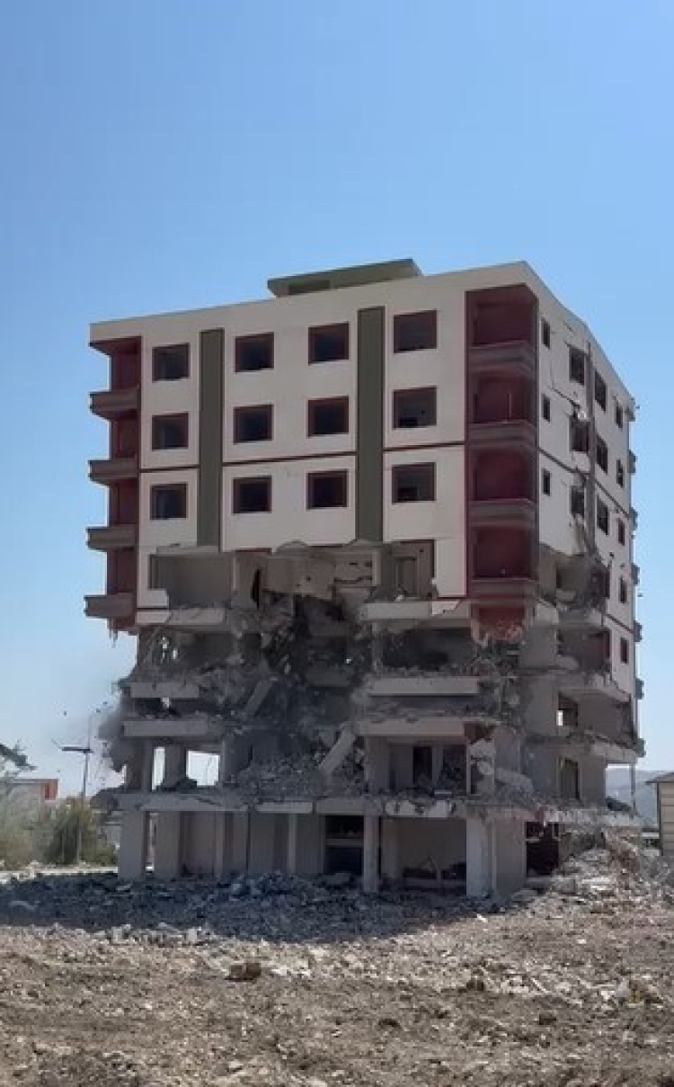 Antakya ilçesi Küçükdalyan Mahallesi'nde bulunan 8 katlı bina, iş makinesinin dokunuşuyla kontrollü olarak yıkıldı.