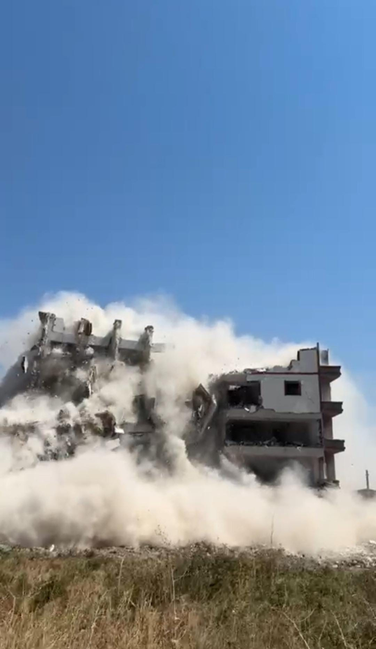 Hatay'ın Antakya ilçesinde 8 katlı binanın iş makinesinin darbesiyle kontrollü olarak yerle bir olduğu anlar kameraya yansıdı.
