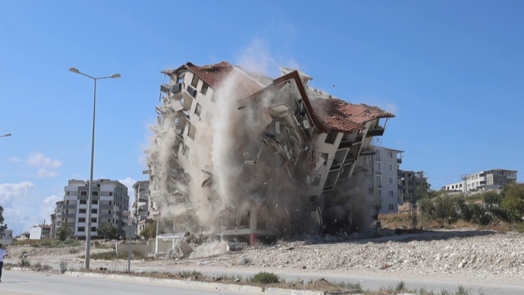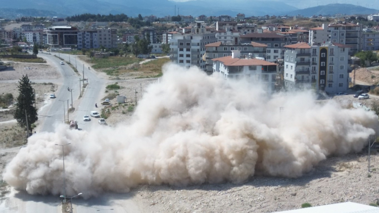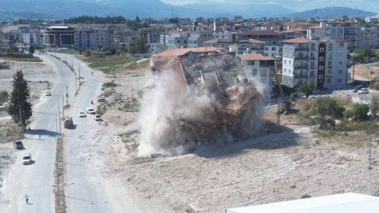 Antakya ilçesi Esentepe Mahallesi'nde bulunan 9 katlı bina, iş makinesiyle kontrollü olarak yıkıldı. 9 katlı binanın yıkımı esnasında herhangi bir olumsuzluk yaşanmazken binanın yıkımı havadan dronla görüntülendi.