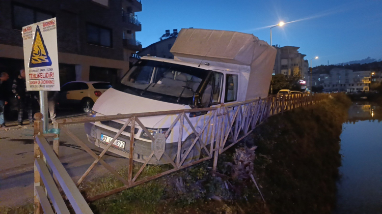 Antalya'nın Manavgat ilçesinde park halindeki otomobile çarptıktan sonra uzaklaşmak isteyen kamyonet, demir korkuluklar sayesinde sulama kanalına düşmekten kurtuldu.