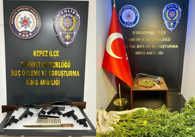 Eş zamanlı olarak gerçekleştirilen aramalarda; 7 ruhsatsız tabanca, 5 ruhsatsız tüfek, 2 kuru sıkı tabanca, 157 fişek, 40 kartuş, 2 bıçak, 22 kök kenevir ve 350 gram uyuşturucu ele geçirildi.