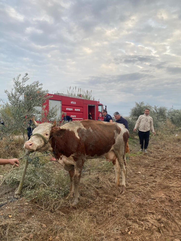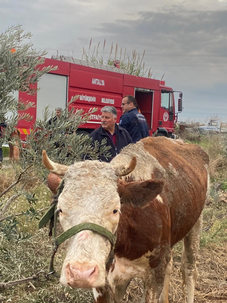 Olay, Serik'e bağlı Karıncalı Mahallesi'nde meydana geldi. Edinilen bilgiye göre, arazide otlarken sulama kanalına düşen ineği fark eden vatandaşlar durumu itfaiyeye bildirdi. İhbarla bölgeye gelen Antalya Büyükşehir Belediylesi Serik İtfaiye birimi ekibi vatandaşların da desteğiyle halatla ineği bulunduğu yerden çıkardı.