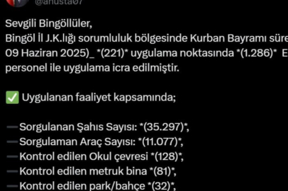 Bingöl’de Kurban Bayramı süresince İl Jandarma Komutanlığı ekipleri huzur ve güveni sağlamak için gece gündüz çalıştı. Bu çerçevede 221 uygulama noktasında bin 286 ekip ve 492 personel görev aldı. Uygulanan faaliyet kapsamında, 35 bin 297 şahıs ve 11 bin 77 araç sorgulanırken 128 okul çevresi, 81 metruk bina, 32 park ve bahçe ile 13 işletme kontrol edildi.