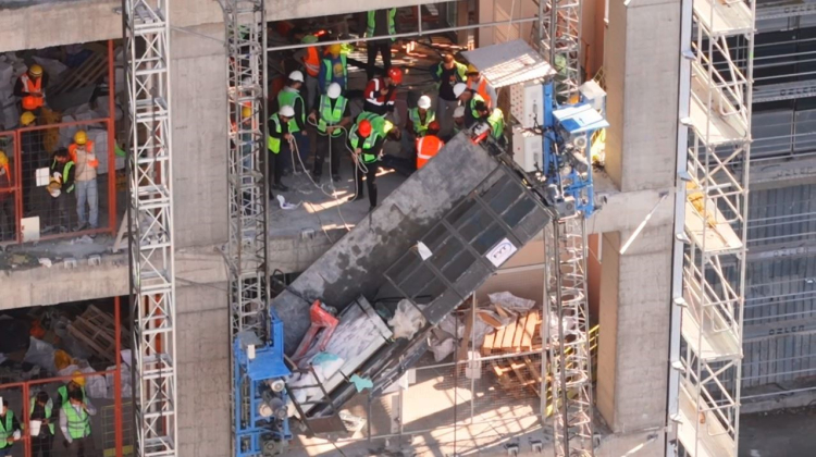 Bir işçi zemine düşerek yaralanırken, asansörde kalan diğer işçi, itfaiyenin yardımıyla kurtarıldı. O anlar dron kamerasına yansıdı.