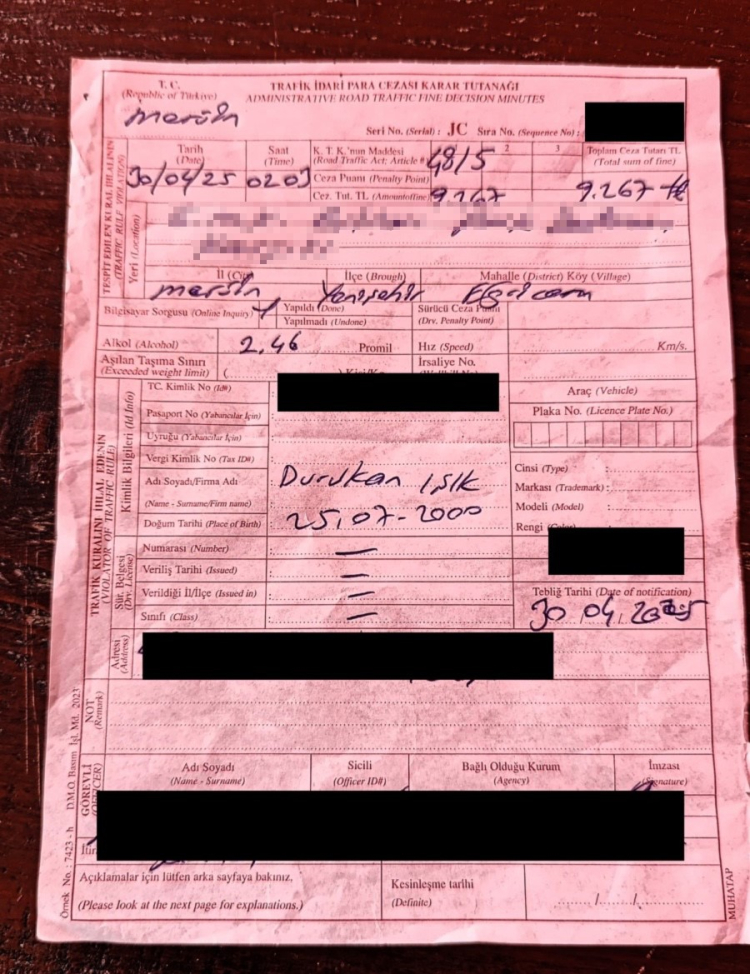 Olay, merkez Yenişehir ilçesine bağlı Gazi Mustafa Kemal (GMK) Bulvarı'nda 30 Nisan'da yaşandı. Gece saatlerinde GMK Bulvarı üzerinde atıyla markete gittiğini iddia eden 25 yaşındaki Durukan Işık, devriye görevi yapan polis ekipleri tarafından durduruldu. Yapılan kontrollerde alkollü olduğu belirlenen Işık'a, ‘alkollü araç kullanmaktan' 9 bin 270 TL idari para cezası uygulandı. Ayrıca, ‘yerleşim yerleri dışındaki kara yollarında zorunlu haller dışında hayvan bulundurmak' suçundan da 993 TL ceza kesildi.