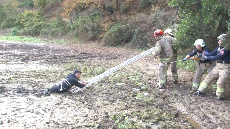 Sancaktepe'de Aydos Millet Bahçesi'nde balık tutmaya gelen genç, göletin karşısına geçmek için yürüdüğü bataklığa saplandı.