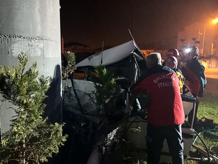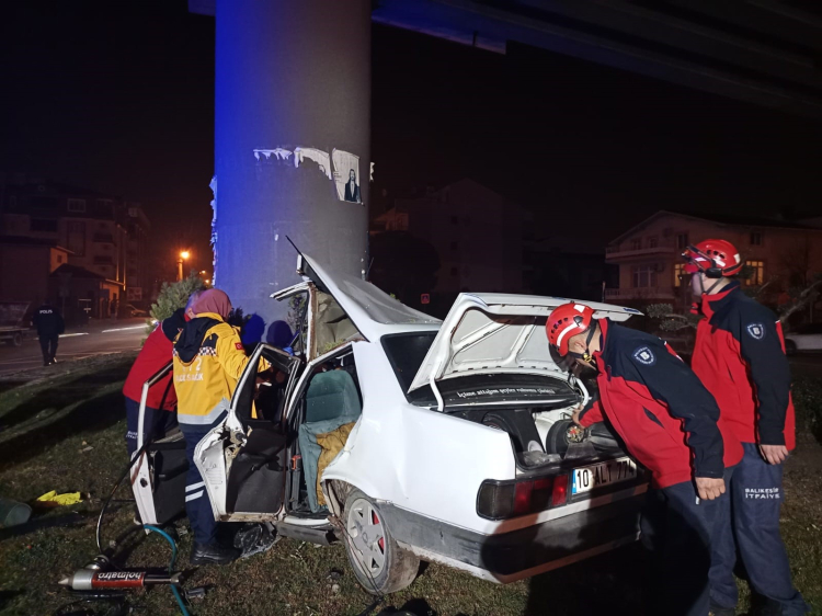 Balıkesir'de otomobiliyle üst geçit ayağına çarpan sürücü sıkışarak hayatını kaybetti.