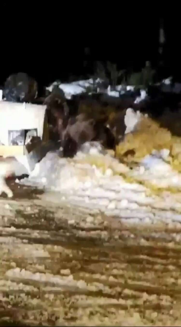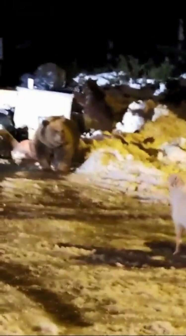 Ormandan yerleşime gelen ve çöpleri karıştıran ayılar yemek yüzünden köpeklerle kavga ederken, ormandan karayoluna gelen bir tilki ise yiyecek aradı.