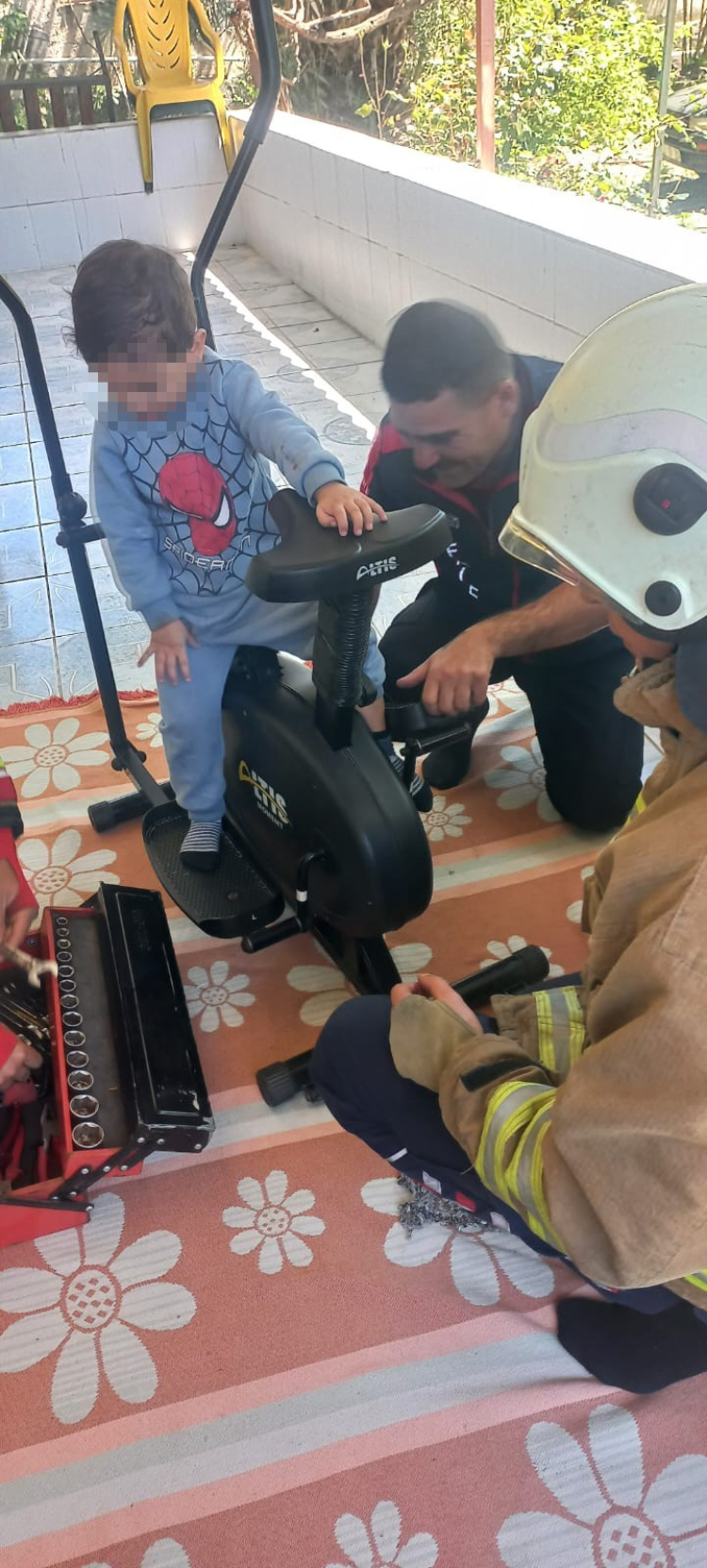 Hatay’ın Erzin ilçesinde spor aleti olan eliptik bisikletin pedalına ayağı sıkışan çocuğu itfaiye ekipleri kurtardı.