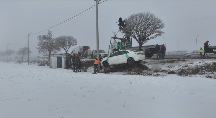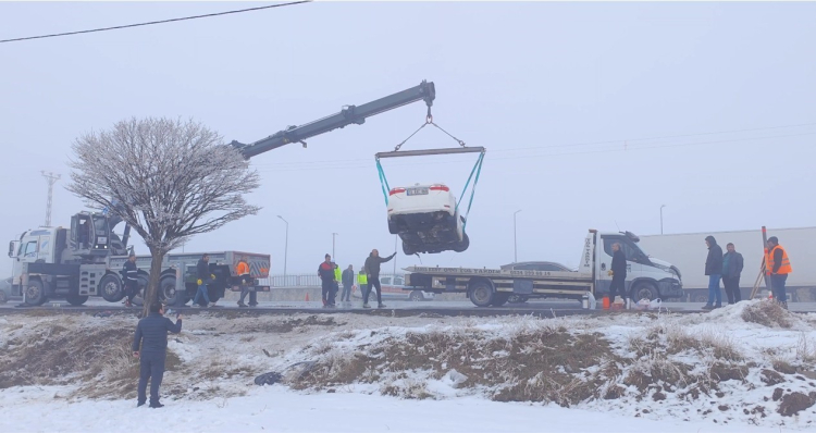 Yol kenarına savrulan araçlar vinçler yardımıyla tek tek bölgeden alınmaya başladı. Ekiplerinin bölgedeki kontrollü çalışmaları devam ederken, bölgedeki yoğun sisin yoğunluğu dron kamerasına yansıdı.