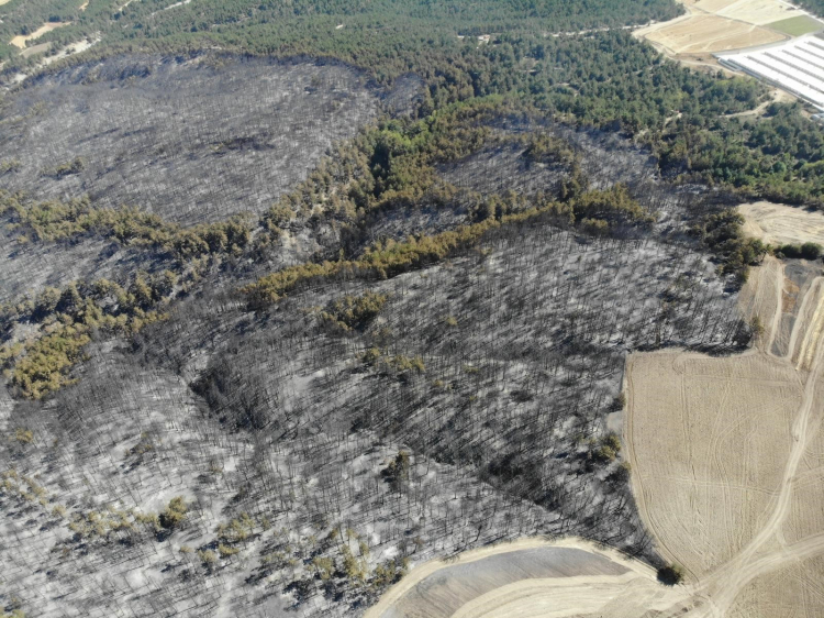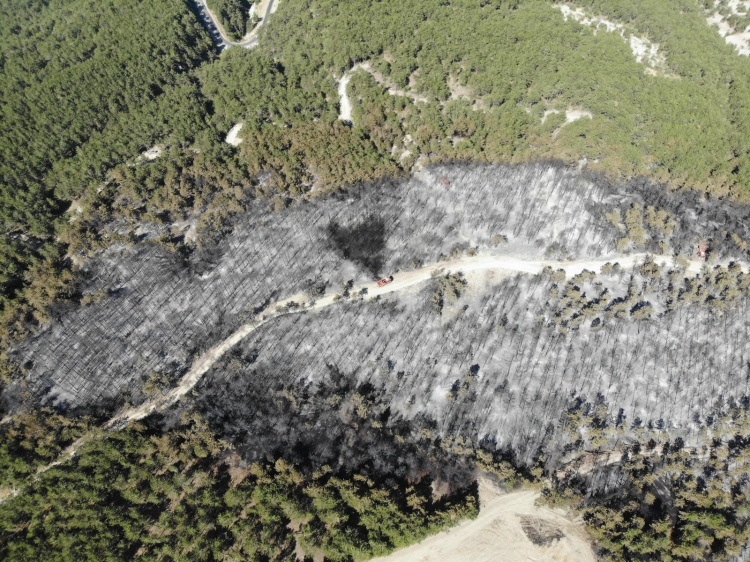 Yangının etki ettiği geniş alan, havadan dronla görüntülendi. Alevlerin küle çevirdiği ormanlık alanın bir kısmı yeşil bir kısmı ise siyaha döndü. Ateş savaşçılarının, çoğu bölgede soğutma çalışmaları sürüyor.