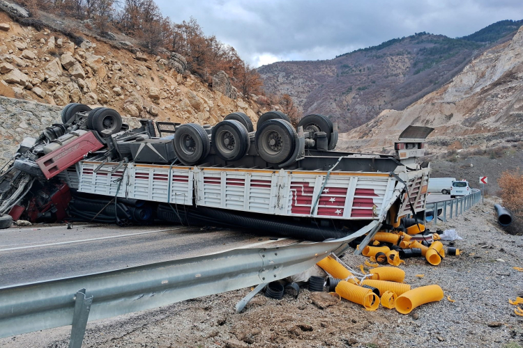 Kapanan yolun ulaşıma açılması için Jandarma ve Karayolları ekiplerin tırı ve yola devrilen boruları temizleme çalışmalarının ardından yol tek şeritten ulaşıma açılırken çalışmalar devam ediyor.
