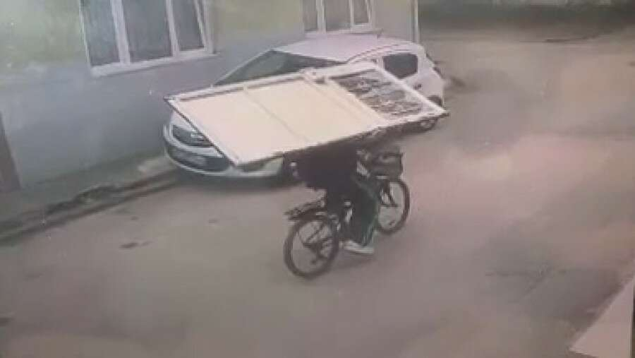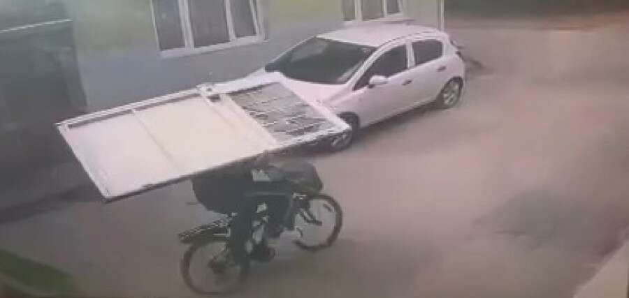 Bursa'da bir hırsız evin depo kısmında bulunan kapıyı sırtlayıp bisikletle kayıplara karıştı. Hırsızın hem bisiklet sürüp hem de bisiklet üzerinde kapıyı taşıması izleyenleri hayrete düşürürken, o anlar güvenlik kamerasına yansıdı.