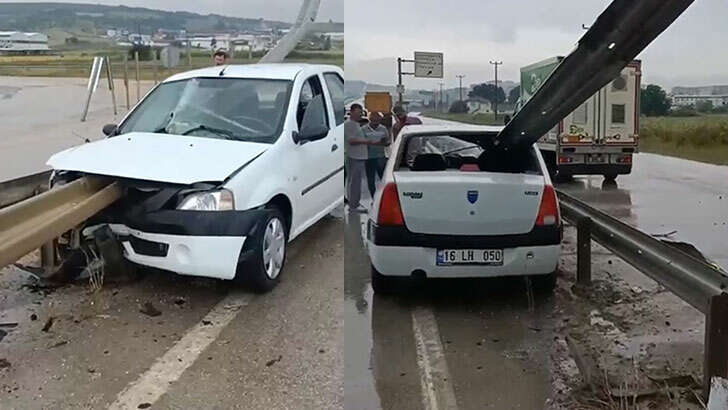 Bursa’da yağışlı havanın etkisiyle kontrolden çıkan otomobil bariyerlere ok gibi saplandı. Kaza da şans eseri kimse zarar görmedi.