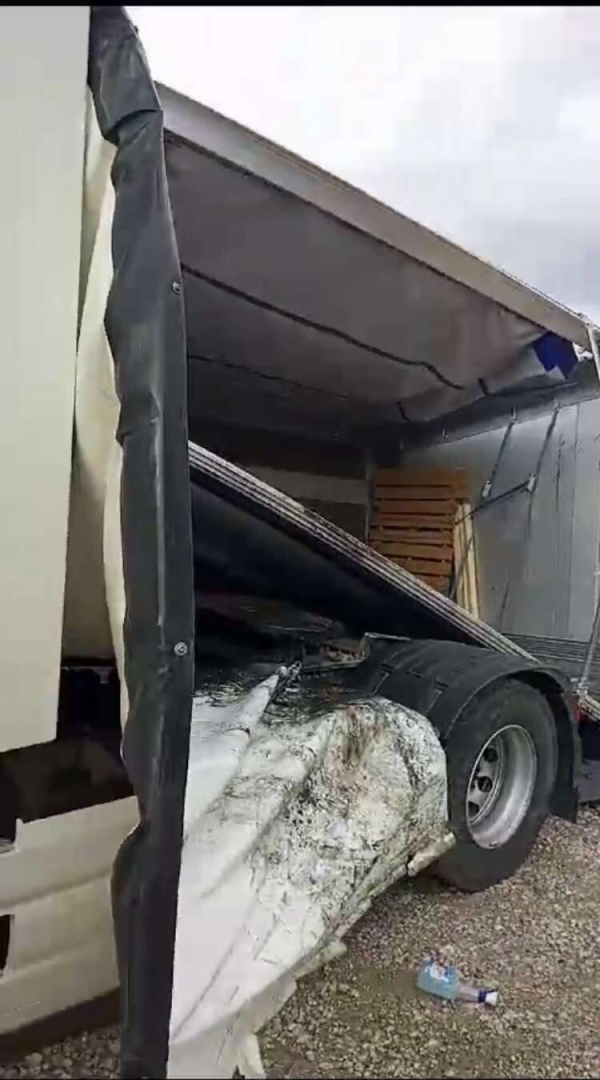 Bursa’da etkili olan fırtına Erikli Su Fabrikası'nın bahçesindeki Mercedes tırları devirdi.