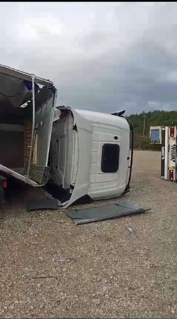 Bursa’da dün geceden beri etkisini sürdüren fırtına Kestel Derekızık’ta tesisleri bulunan Erikli Su Fabrikası'ndaki 4 tır ve 1 dorseyi devirdi.