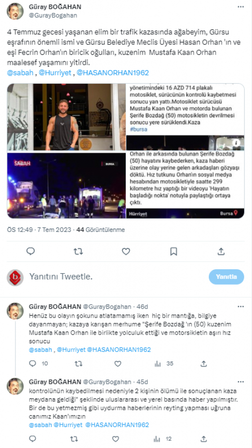 Bursa’da Gürsu Belediye Meclis Üyesi Hasan Orhan'ın oğlu Mustafa Kaan Orhan, motosikletiyle çarptığı yaya ile birlikte hayatını kaybetmişti. Güray Boğahan, kuzeni Mustafa Kaan Orhan hakkında çıkan haberlere dair açıklamalarda bulunarak sitemini dile getirdi.