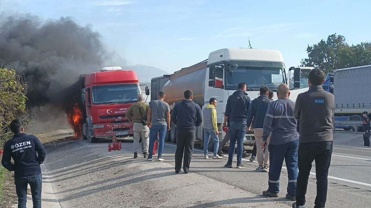 Bursa-İzmir Karayolu üzerinde bir kamyon seyir halindeyken alev alev yandı.
