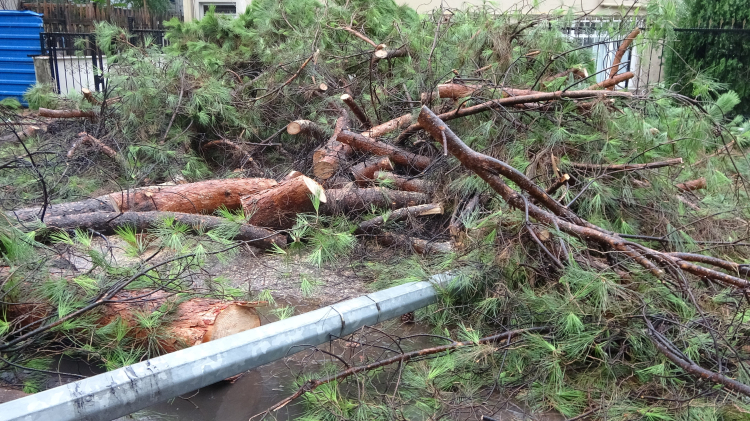 Bir evin çatısına yıldırım düşerken, yağışa dayanamayan ağaç devrildi.