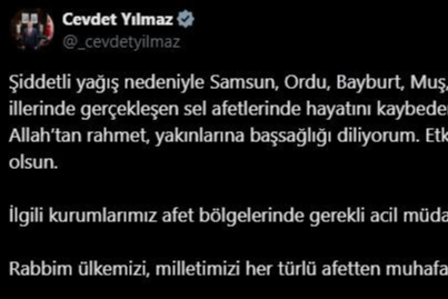Yılmaz, sosyal medya hesabından yaptığı paylaşımda, "Şiddetli yağış nedeniyle Samsun, Ordu, Bayburt, Muş, Erzurum ve Kars illerinde gerçekleşen sel afetlerinde hayatını kaybeden vatandaşlara Allah’tan rahmet, yakınlarına başsağlığı diliyorum.