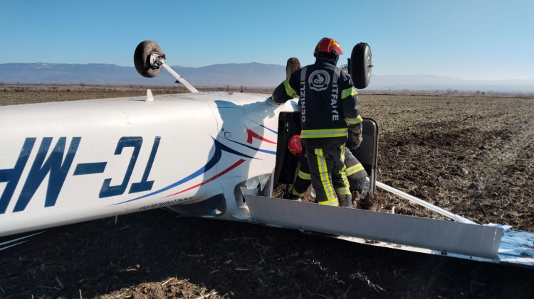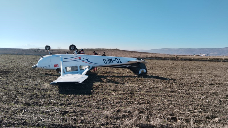 Tarlaya ters bir şekilde düşen uçağın pilotu yaralandı.