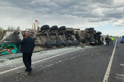 Diyarbakır-Şanlıurfa kara yolu 30'uncu kilometresinde sebze yüklü kamyon devrildi.