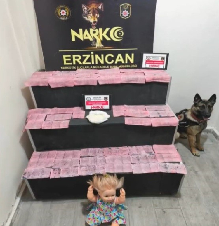 Erzincan’da durdurulan araçta narkotik köpeği destekli yapılan aramada oyuncak bebeğin içerisine saklanmış toplamda 49 bin 500 kullanımlık sentetik cannabinoid (bonzai) maddesi ele geçirildi.
