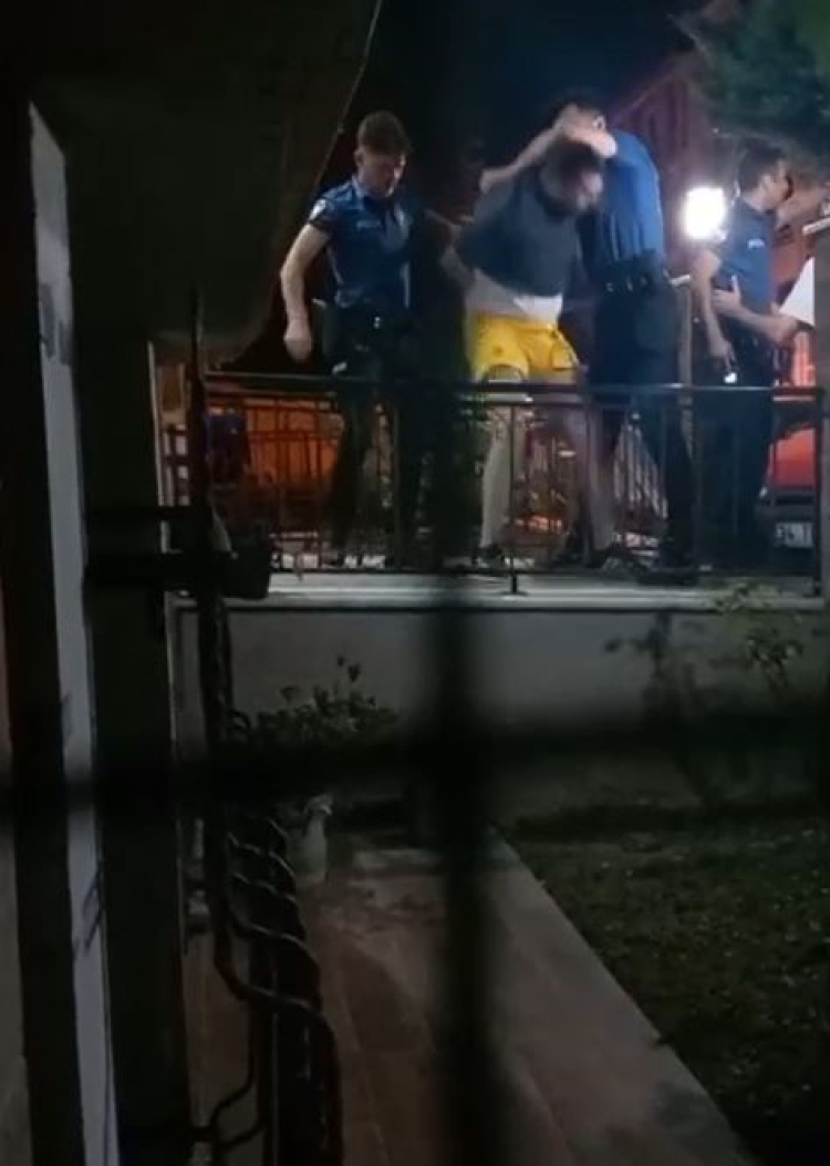 Bu sırada eşi cama çıkarak "Yardım edin" diye bağırdı. Yardım çığlığını duyan mahalleli hemen polise haber vererek duruma müdahale etmek istedi. O sırada bıçakla sokağa inen adam, etraftakilere saldırdı. Polisin gelmesiyle gözü dönmüş adam, güçlükle gözaltına alınırken, o anlar kameraya yansıdı.