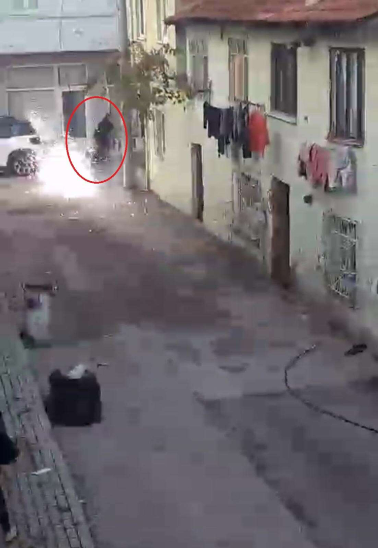 Bursa’da bir sokaktaki elektrik teli kıvılcım çıkarmaya başladı. Arızayı ve patlamaları gören bir kadın ise o anları cep telefonuyla kayda alırken, kopan kablo kadının bulunduğu yere düştü.
