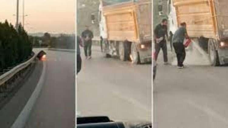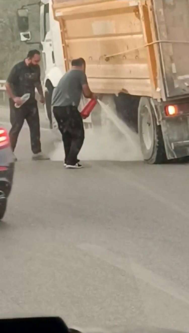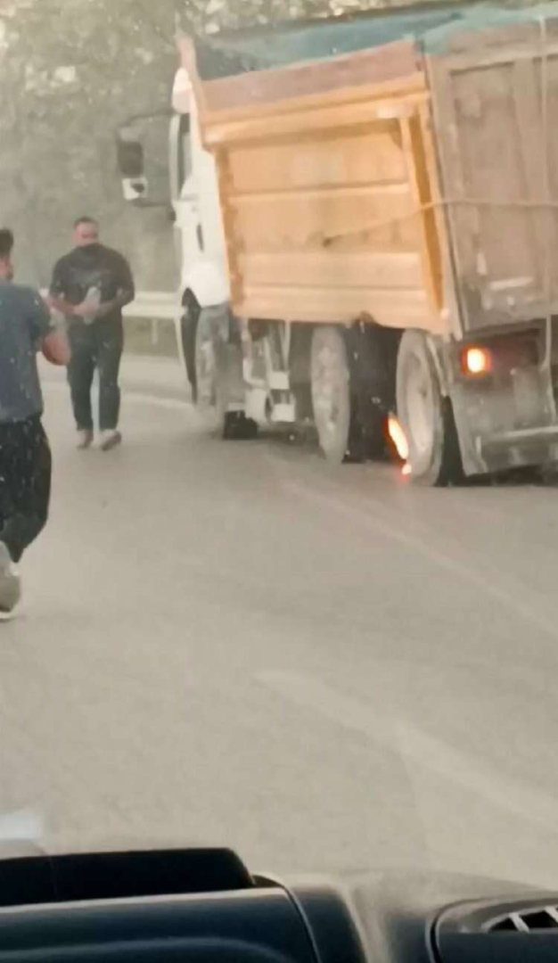 Anayolda ilerleyen bir kamyon sürücüsü, kamyonun tekerinin fırlamasıyla şoke oldu. Hemen aracı kenara çeken sürücü, eline aldığı suyla lastiklerin bulunduğu kısımda çıkan alevleri söndürmeye çalıştı.