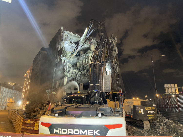 Binanın yıkım çalışmaları, trafiği tehlikeye düşürmemek ve yoğunluk yaşanmaması için gece saatlerinde yapılırken yıkım işlemlerinin bir kaç gün daha süreceği öğrenildi.