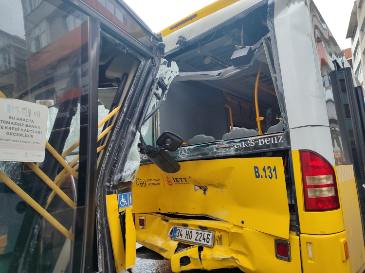 Fatih’te seyir halindeki 2 İETT otobüsü ve 3 otomobilin karıştığı zincirleme kaza meydana geldi. Ortalığın savaş alanına döndüğü kazada iş yerleri sallandı.