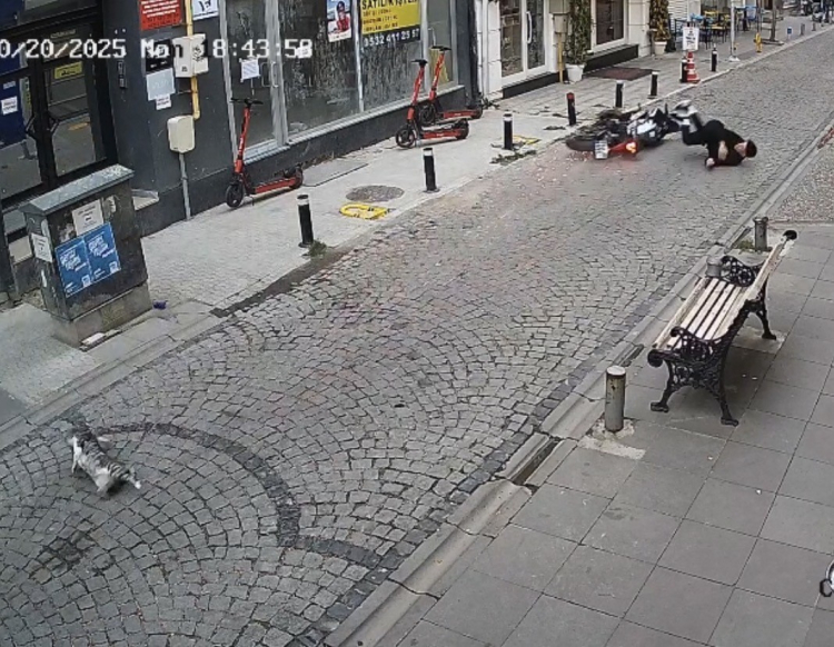 Sürücünün hem kediye çarptığı hem de başını beton saksıya vurarak ağır yaralandığı kaza anı güvenlik kamerasına yansıdı.