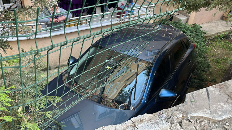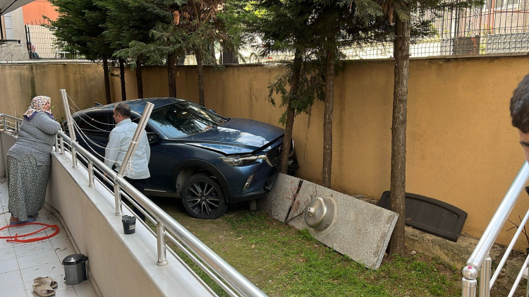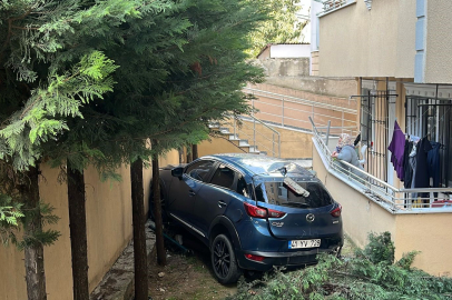 Kocaeli'nin Gebze ilçesinde geri manevra yapan otomobil kontrolden çıkarak yaklaşık 3 metre yükseklikteki duvarı aşıp binanın bahçesine düştü.