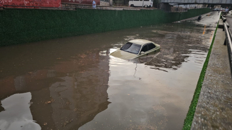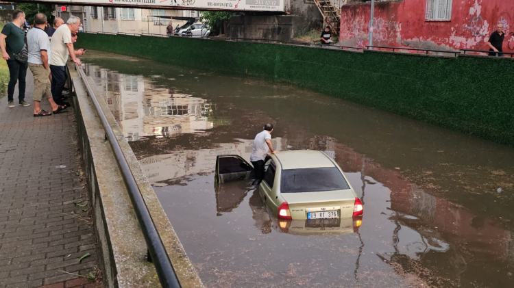 Diğer tarafta ise uyarı bariyeri konuldu. Uyarı bariyerini fark etmeyen bir sürücü hızla girdiği alt geçitte otomobili ile sulara gömüldü.