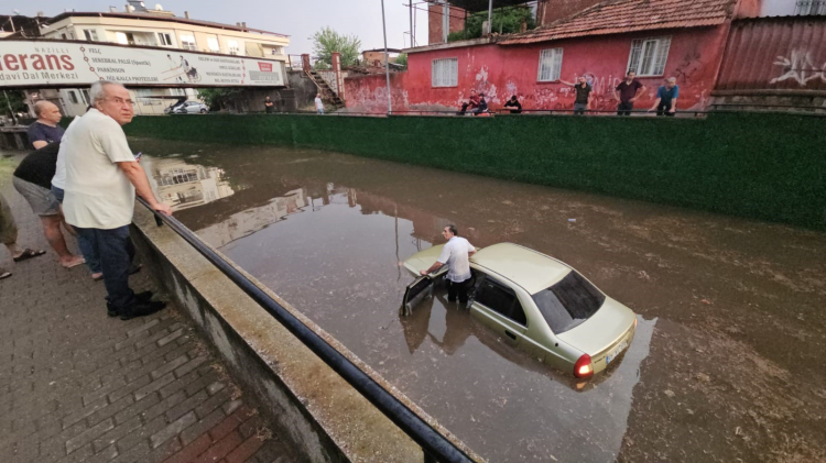 Su basan alt geçidi fark etmeyen bir sürücü uyarı tabelalarına rağmen aracı ile sulara gömüldü.