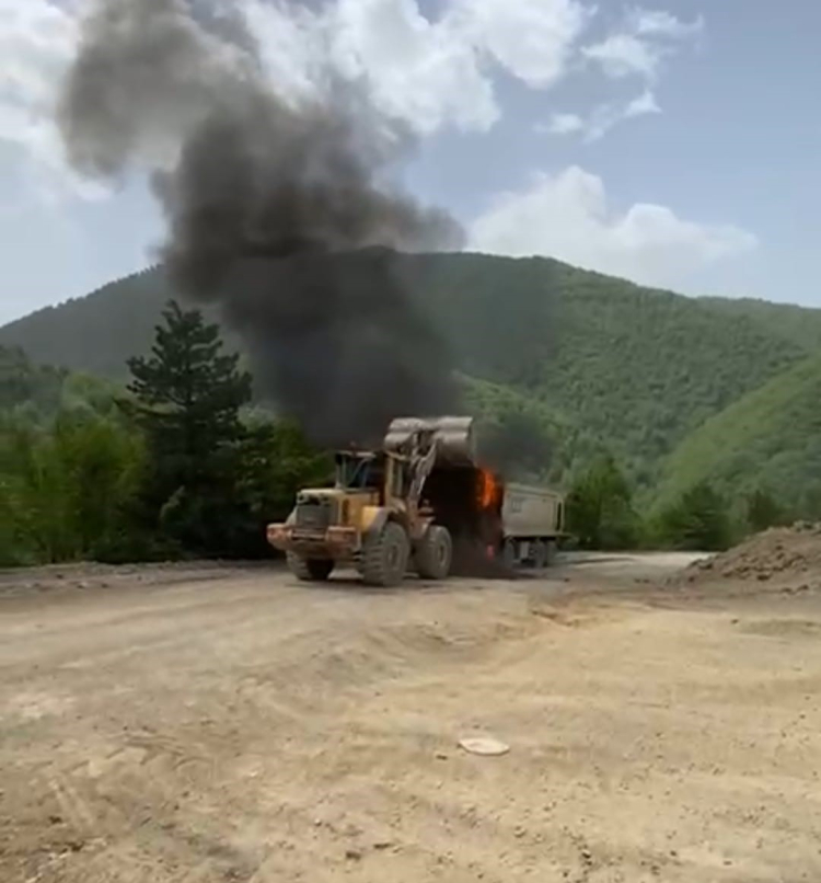 Sinop’un Türkeli ilçesine bağlı Gökçealan köyünde yol inşaatında kullanılan taş yüklü bir kamyon, seyir halindeyken aniden alev aldı.