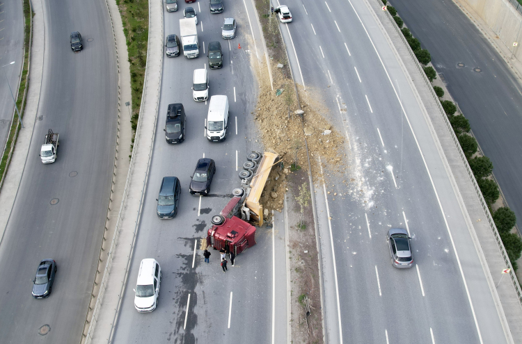 Başakşehir'de sürücüsünün direksiyon hakimiyetini kaybettiği hafriyat kamyonu devrildi.