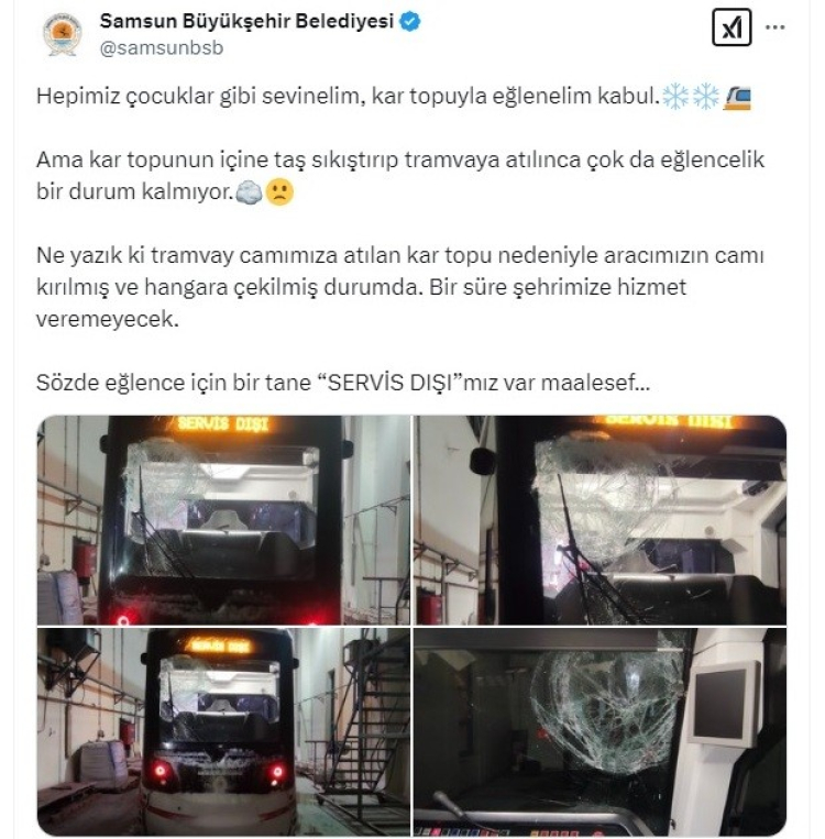 Samsun Büyükşehir Belediyesi, yaptığı sitem dolu paylaşımla olayı duyurdu. Paylaşımda, "Hepimiz çocuklar gibi sevinelim, kartopuyla eğlenelim kabul. Ama kartopunun içine taş sıkıştırıp tramvaya atılınca çok da eğlencelik bir durum kalmıyor. Ne yazık ki tramvay camımıza atılan kartopu nedeniyle aracımızın camı kırılmış ve depoya çekilmiş durumda. Bir süre şehrimize hizmet veremeyecek. Sözde eğlence için bir tane ‘servis dışı’mız var maalesef" denildi.