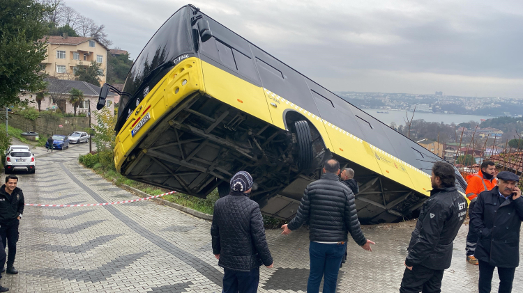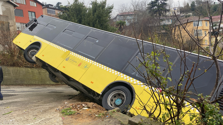 Beykoz'da sürücüsünün park halinde bıraktığı İETT otobüsü yokuş aşağı kayarak bir evin bahçesine düştü.