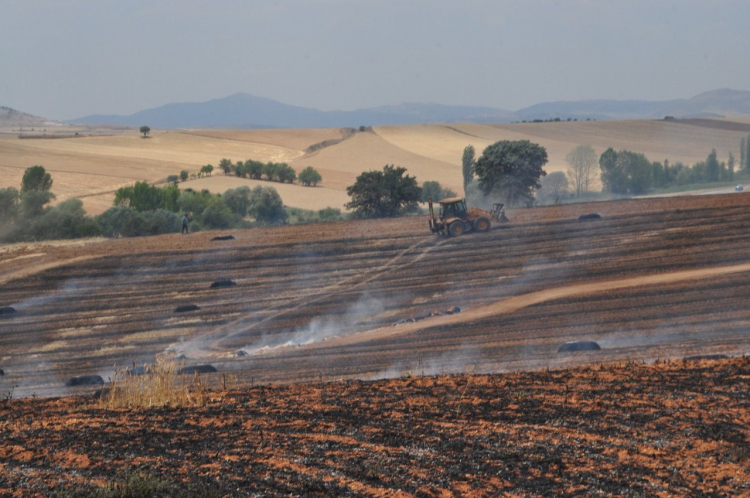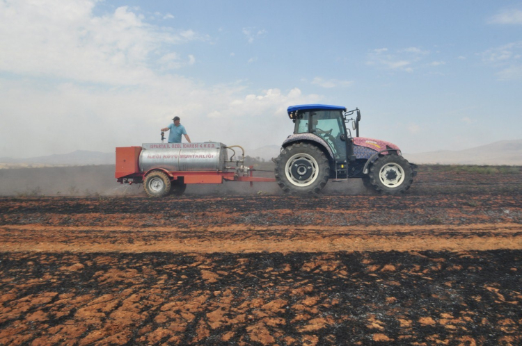 Isparta'nın Yalvaç ilçesine bağlı Sücüllü köyünde balya makinesinden çıkan kıvılcımla başlayan yangın, rüzgarın etkisiyle hızla yayılarak 100 dönümlük tarım arazisini küle çevirdi.