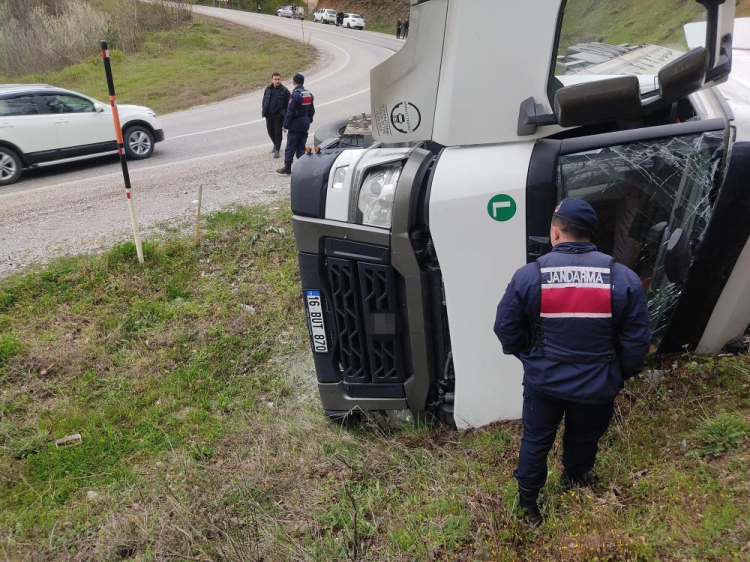 Domaniç istikametinden İnegöl'e seyir halinde olan Murat B.(39) yönetimindeki 16 BUT 870 plakalı su yüklü tır, yokuş aşağı inerken frenlerinin patlaması sonucu sürücüsünün kontrolünden çıktı. Yoldan çıkan tır yamaca devrildi. Kaza yerine 112, jandarma ve itfaiye arama kurtarma ekipleri sevk edildi. Kaza sonucu yaralanan sürücü, tırın camı kırılarak ekiplerce kurtarıldı.