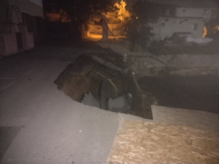 Su borusu hattının patlaması sonucu güvenlik tedbiri olarak sular kesilirken, çöken yolun başındaki bina tedbir amaçlı tahliye edildi.