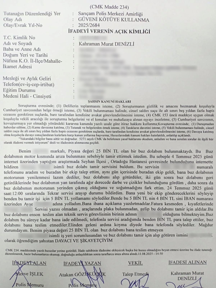 İddiaya göre, bu sırada üzerinde teknik servis kıyafeti olmayan ve plakasız bir hafif ticari araçla gelen 2 kişi buzdolabını götürdü. Denizli ise bu anları cep telefonuyla kaydetti. Aradan birkaç gün geçtikten sonra teknik servisi arayan Denizli, sürekli, 'bugün geleceğiz veya 1-2 gün içerisinde geleceğiz' diyerek yanıt aldı. En son teknik servisle görüşen Denizli, 'sizin bin lira bakiyeniz kalmıştı, onu ödeyin buzdolabını getirelim' yanıtı aldı.