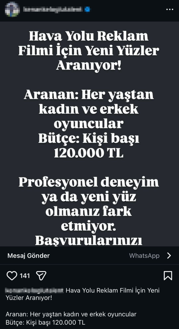 İstanbul’da sosyal medya üzerinden verilen "oyuncu aranıyor" ilanlarına başvuran kişilerin, yüksek ücret vaadiyle kandırılarak tek taraflı sözleşmeler imzalatıldı ve eğitim ücreti adı altında ödeme alındı. İddiaya göre, ilanlara başvuran kişiler WhatsApp üzerinden görüşmeye çağrıldı. Reklam filmi ve dizi projelerinde rol verileceği, bölüm başı 100 ila 140 bin lira kazanacakları söylendi. Görüşmede mağdurlara sözleşme imzalatıldığı, sözleşmenin okunmasına izin verilmediği ve kopyasının verilmediği ileri sürüldü.