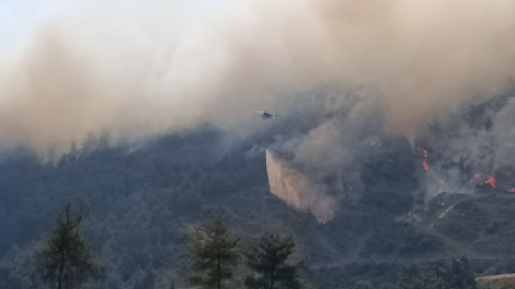 Bu nedenle Allah'a şükür bir can kaybımız ya da yaralımız yok. Yukarıda yangına 9 helikopter ve 6 uçaklara müdahale ediyoruz. Daha fazla hava aracı alamıyoruz çünkü yangın dar bölgede olduğu için daha fazla araç risk oluşturuyor. Aşağıda ise onlarca arazözümüz, itfaiye aracımız ve TOMA'larımız, dozerlerimizle yangına müdahale ediyoruz.