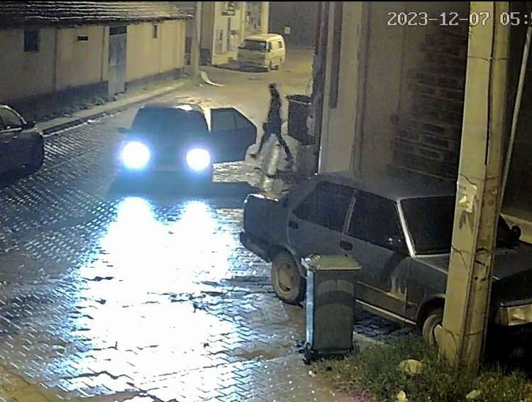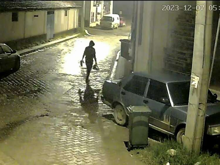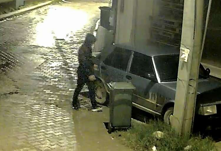 Sokağa yürüyerek giren şüpheli, park halindeki 16 ANH 999 plakalı aracın kapısını zorlayarak açtı. Araçtaki teyp ve malzemeleri alan şahıs, sokaktaki apartmanın girişine malzemeleri sakladı.